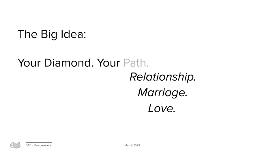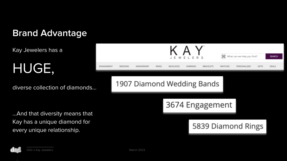 And, Kay's vast selection of diamonds allow for each couple's unique values to be represented by a unique diamond.The Strategy: