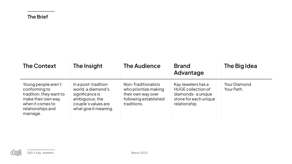 Kay Jewelers is well-known, but outdated. They want to rebrand themselves to better align with young people's values.The Ask