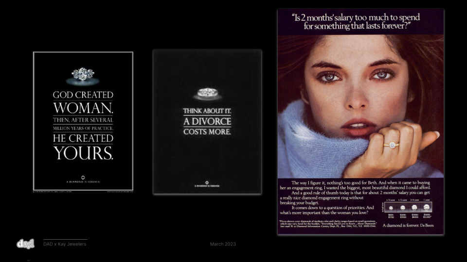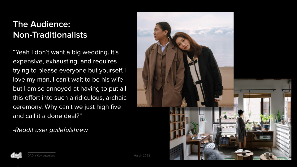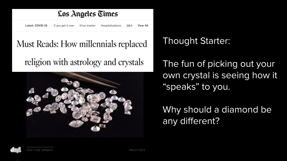 Throughout their history, diamonds in culture & advertising have been synonymous with the 'traditional' path- one that is very prescriptive, transactional, and heteronormative. These values are directly at odds with the younger generation's focus on individual uniqueness and making their own way.Insight: