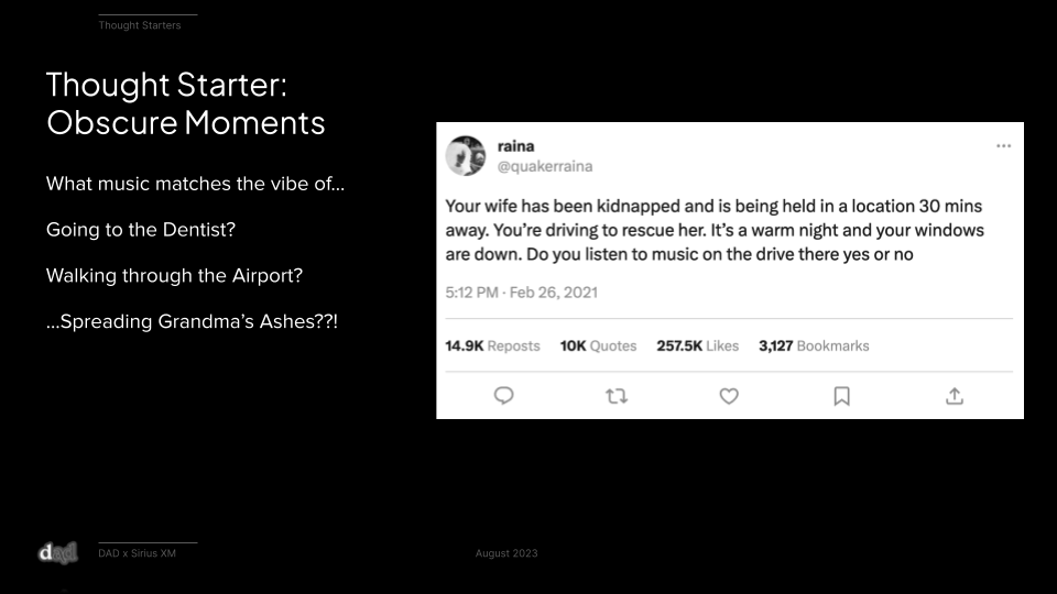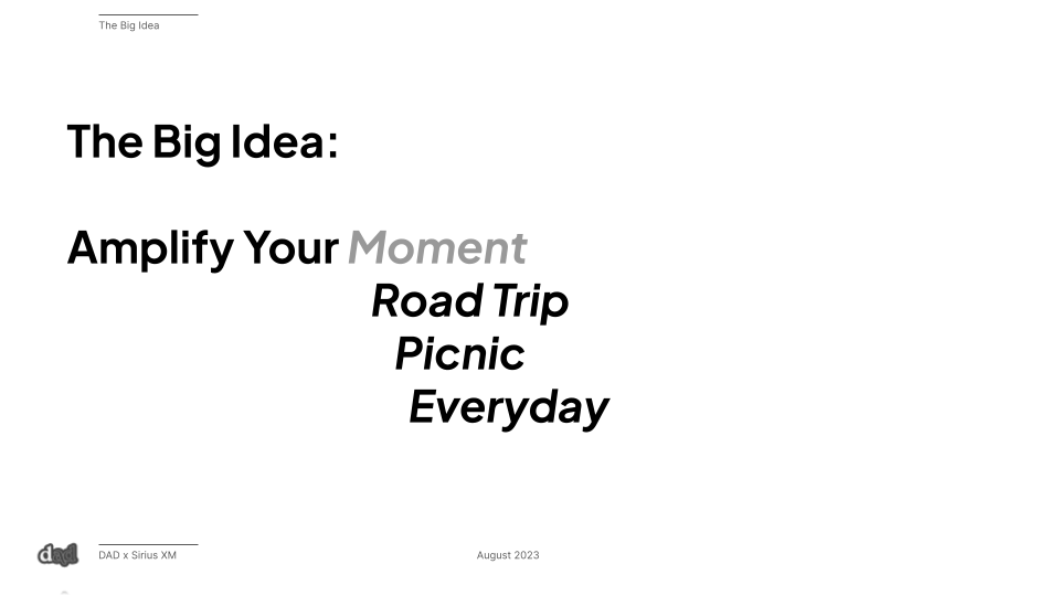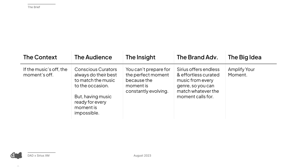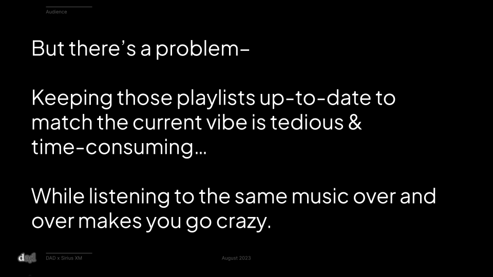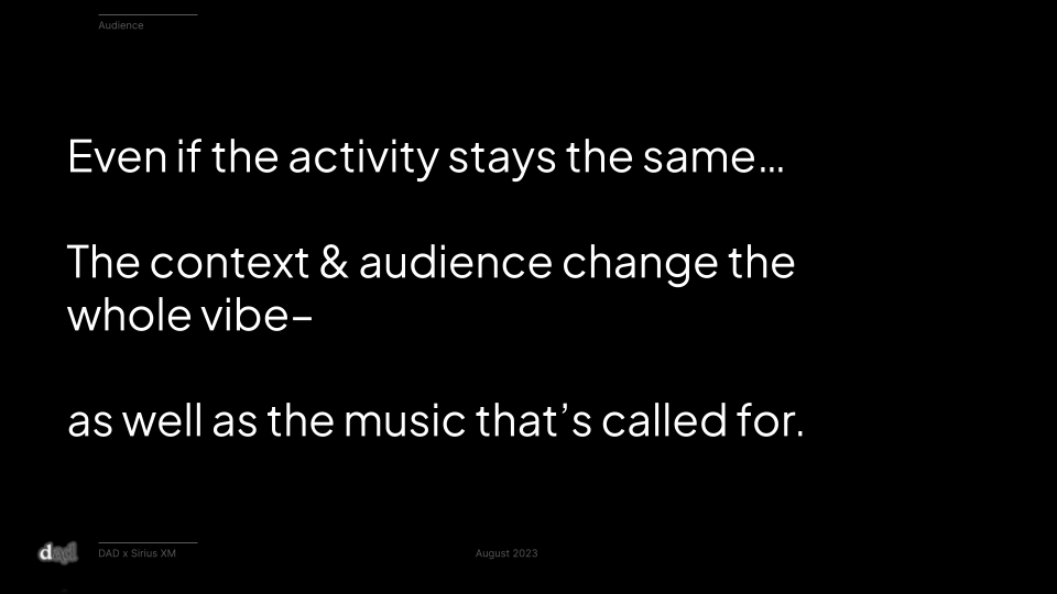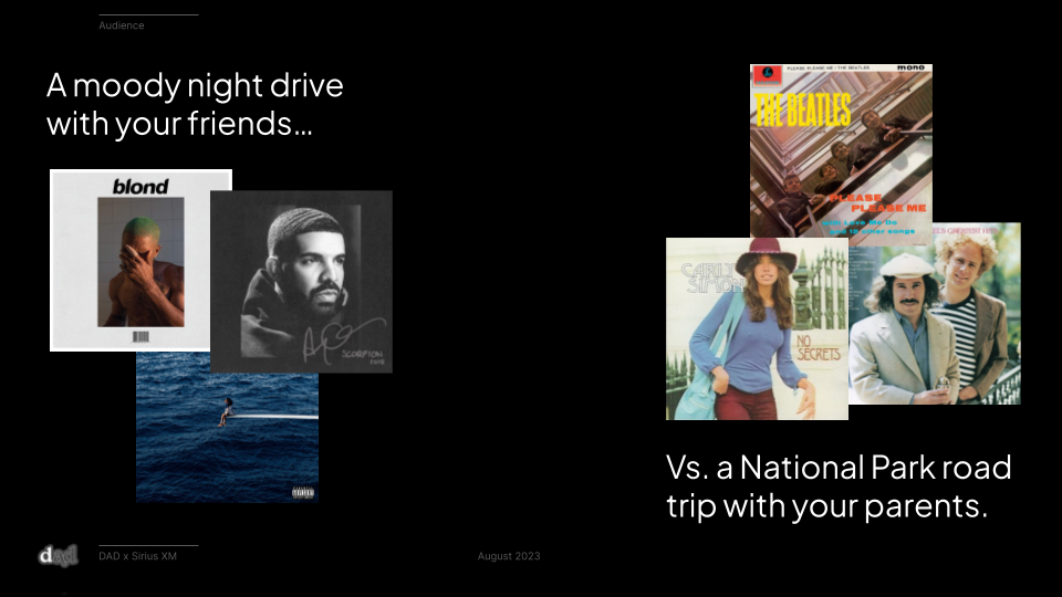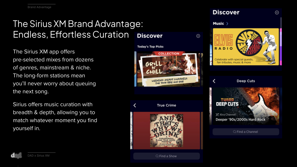 And Sirius XM provides the solution: endless, effortless music curation to match & amplify your moment, whatever it might be.The Strategy: